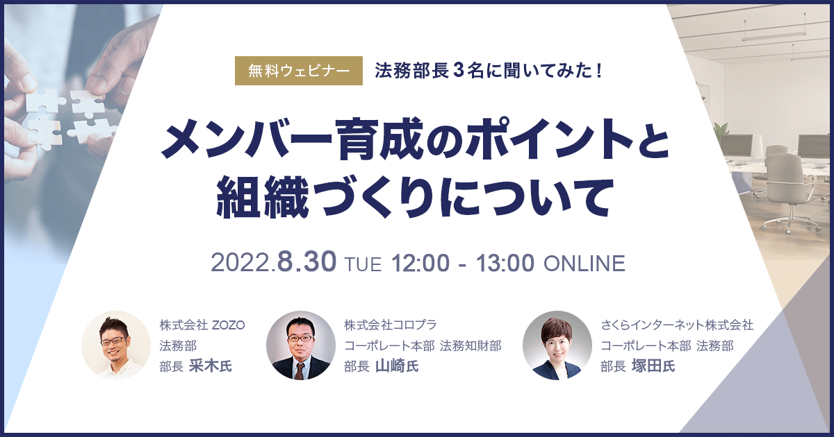 セミナー名 | 【無料ウェビナー】 法務部長3名に聞いてみた!メンバー育成のポイントと組織づくりについて |