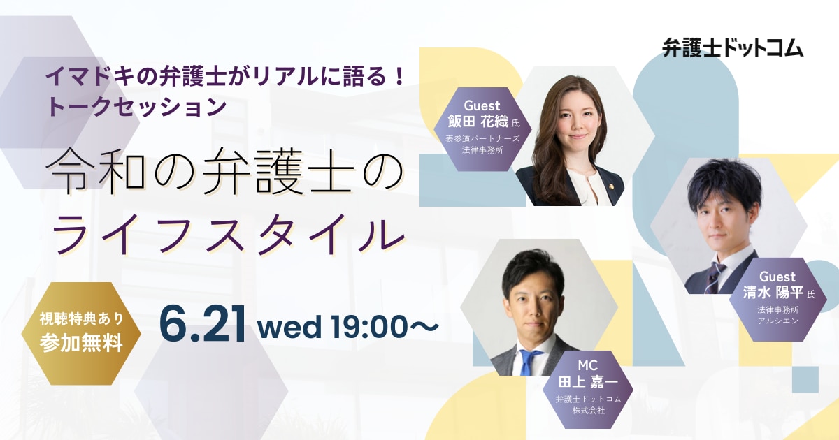 今回は「令和に活躍する弁護士のライフスタイル」と題して、誹謗中傷や炎上対応など、インターネット分野の法律問題に取り組む清水陽平氏と、上場準備や資金調達などスタートアップ支援を得意とする飯田花織氏をお招きし、トークセッションを開催。