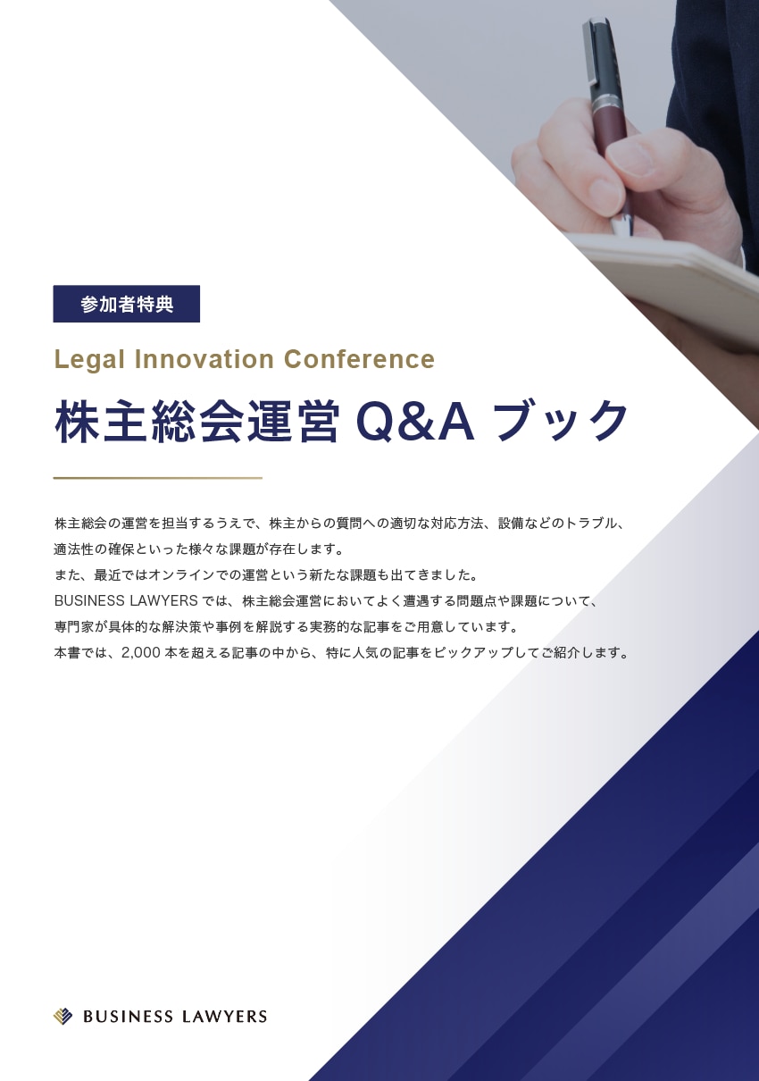会場にお越しいただいた方に、株主総会運営時によく遭遇する課題について専門家が解説した人気記事をまとめた「運営Q&Aブック」をプレゼントいたします。※画像はイメージです。 ※オンライン放映ご視聴者には、PDF版をメールにてお送りします。 ※特典の配布は、10/3(火)の会場にご参加 または 10/17(火)のオンライン放映をご視聴いただいた方のみを対象とさせていただきます。 |