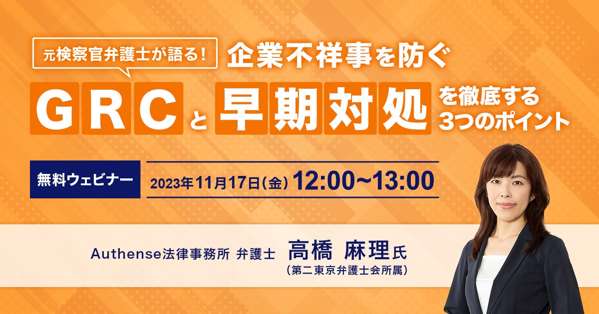 【無料ウェビナー】 元検察官弁護士が語る!企業不祥事を防ぐ「GRC」と「早期対処」を徹底する3つのポイント |
