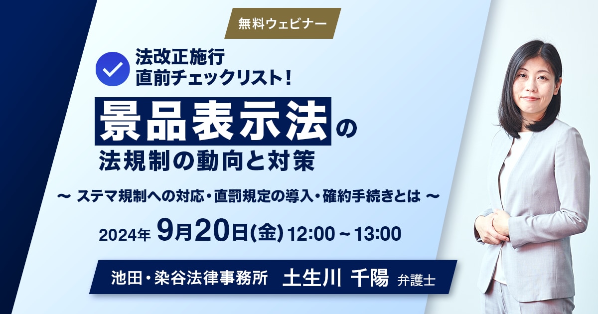 【無料ウェビナー】法改正施行直前チェックリスト!景品表示法の法規制の動向と対策 〜ステマ規制への対応、直罰規定の導入、確約手続きとは〜