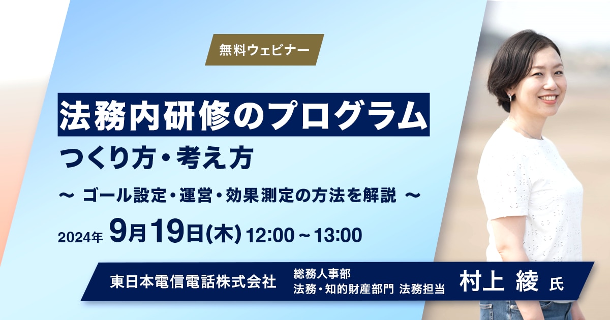 | セミナー名 | 【無料ウェビナー】法務内研修プログラムのつくり方・考え方 〜ゴール設定・運営・効果測定の方法を解説〜 |