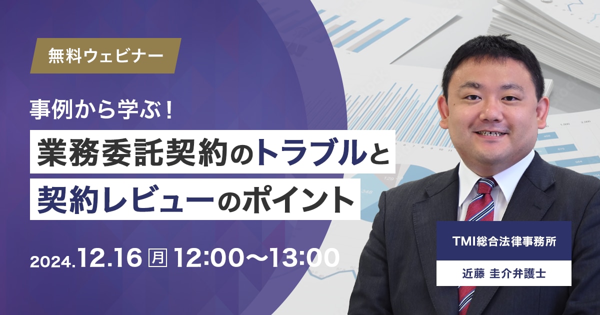 業務委託契約において、中途解約、情報漏えいといったトラブルは頻繁に発生しており、法務担当者としてはその対応に悩むことが多いのではないでしょうか。本セミナーでは、業務委託契約の基本から、具体的なよくあるトラブル事例を学んでいただきます。特に、トラブル事例を含めた、契約書作成時におけるリスクの最小化について、わかりやすく近藤 圭介弁護士(TMI総合法律事務所)に解説いただきます。
