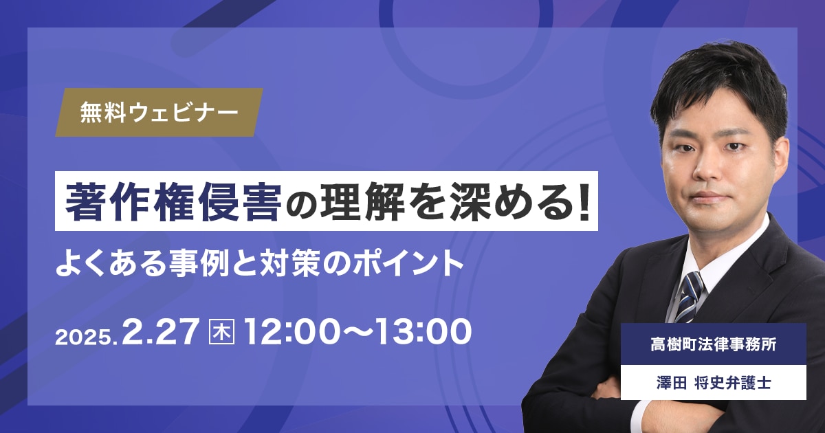 | セミナー名 | 【無料ウェビナー】著作権侵害の理解を深める!よくある事例と対策のポイント |
